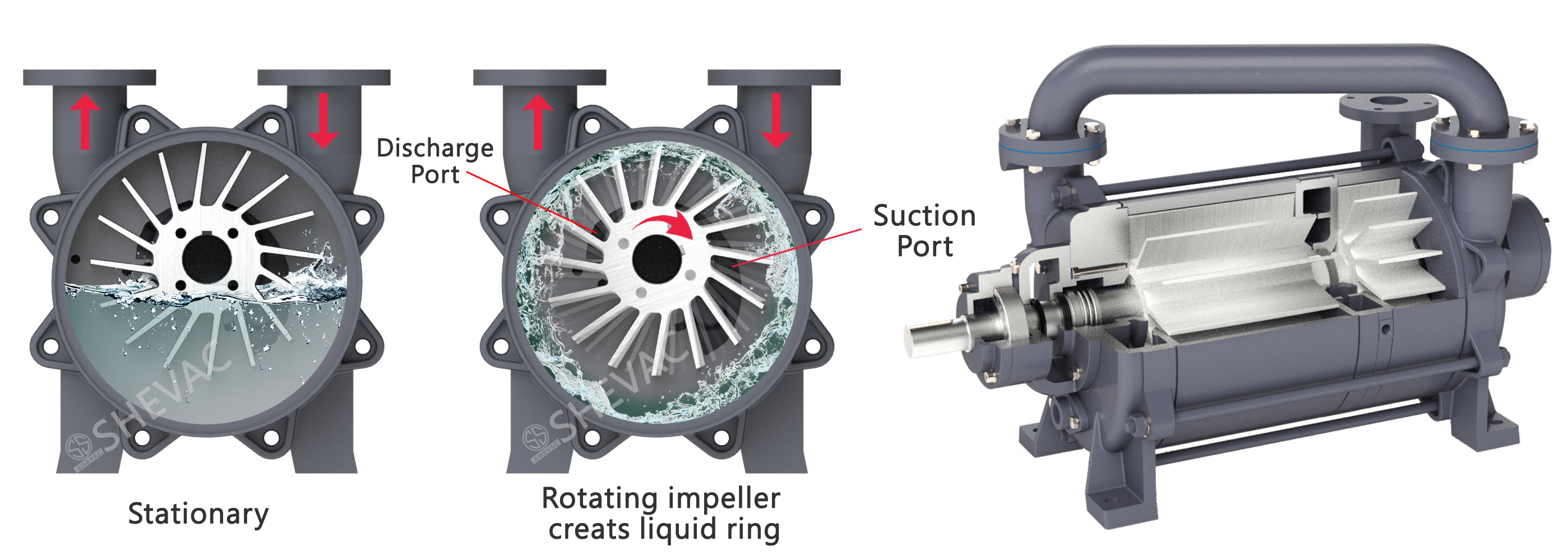 The liquid ring vacuum pumps are used the liquid as the pistoned, during the impeller be rotated, those liquid will be throwed exteriorly and formed a movable liquid ring, that interior is hollowed , Since, the impeller is rotated centrifugally to against the pump housing, when the impeller is rotating, the liquid will be leaved from the liquid ring gradually at inlet, meanwhile, the space that between two impellers will be enlarged gradually and sucked air, otherly, when the impeller be rotated to discharge outlet and the liquid will be into the liquid ring as well as, the space that between two impellers will be decreased, thus, the compressed air will be discharged from outlet, so that the repeat cycle will be over again and again.